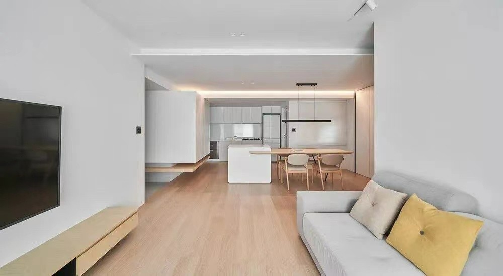 整个空间的色调以白色与木色为主,没有做太满,多一点留白给空间,收纳够用就好,所以有做了一个大储藏室。电视墙面大面的留白,只有做底下矮柜收纳以及延伸窗边卧榻。