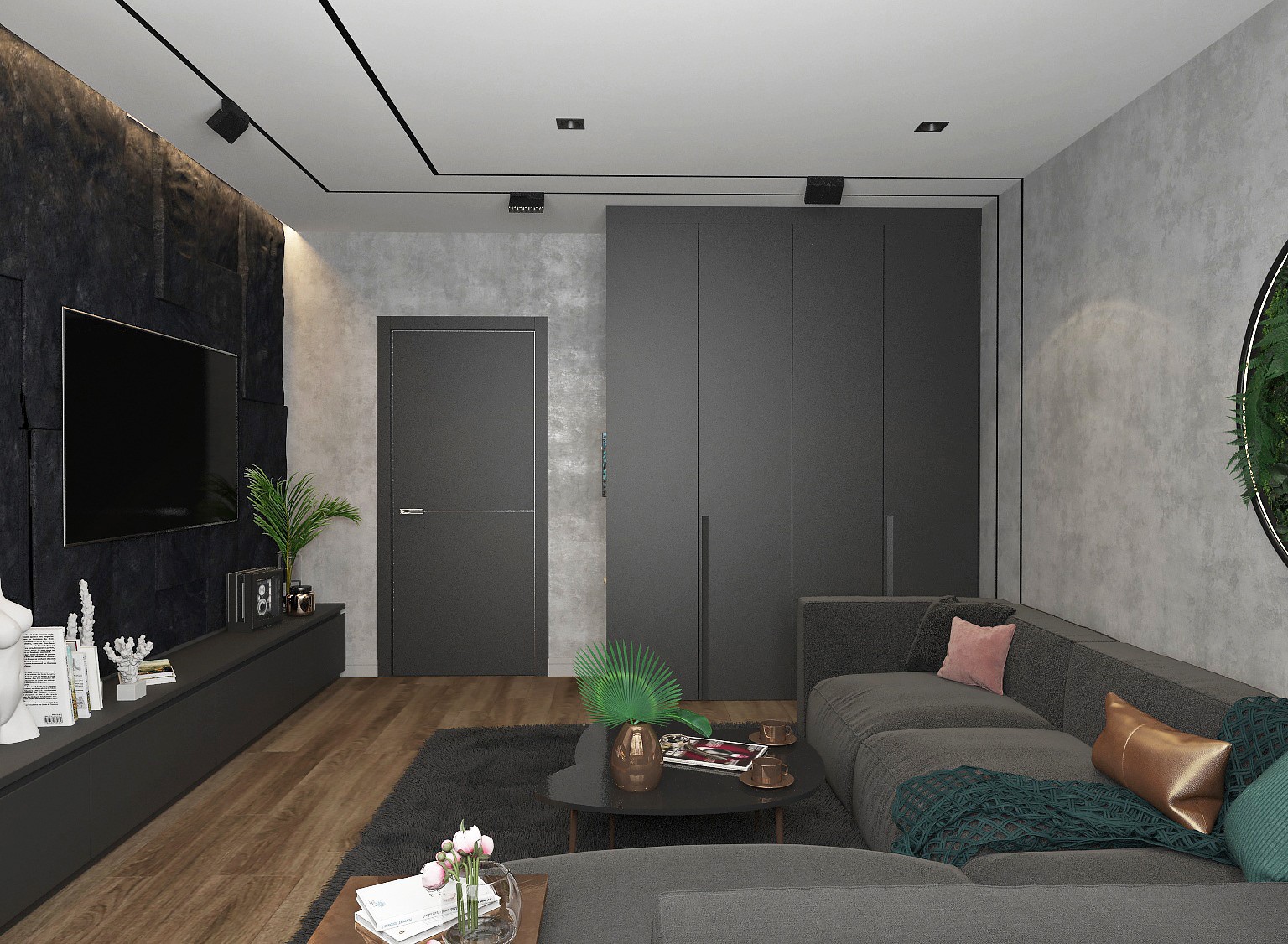 客厅以深灰+浅灰为主色调,轨道灯带和绿植的加入,给原本粗犷随性的空间增添了灵动和活泼的氛围。浓淡灰色系沉稳低调,葱郁的绿植一步深化明暗对比张力,丰富空间层次感。局部以木纹鲜明的木料、黑色岩板及暖黄光点缀,中和低饱和度的生硬。