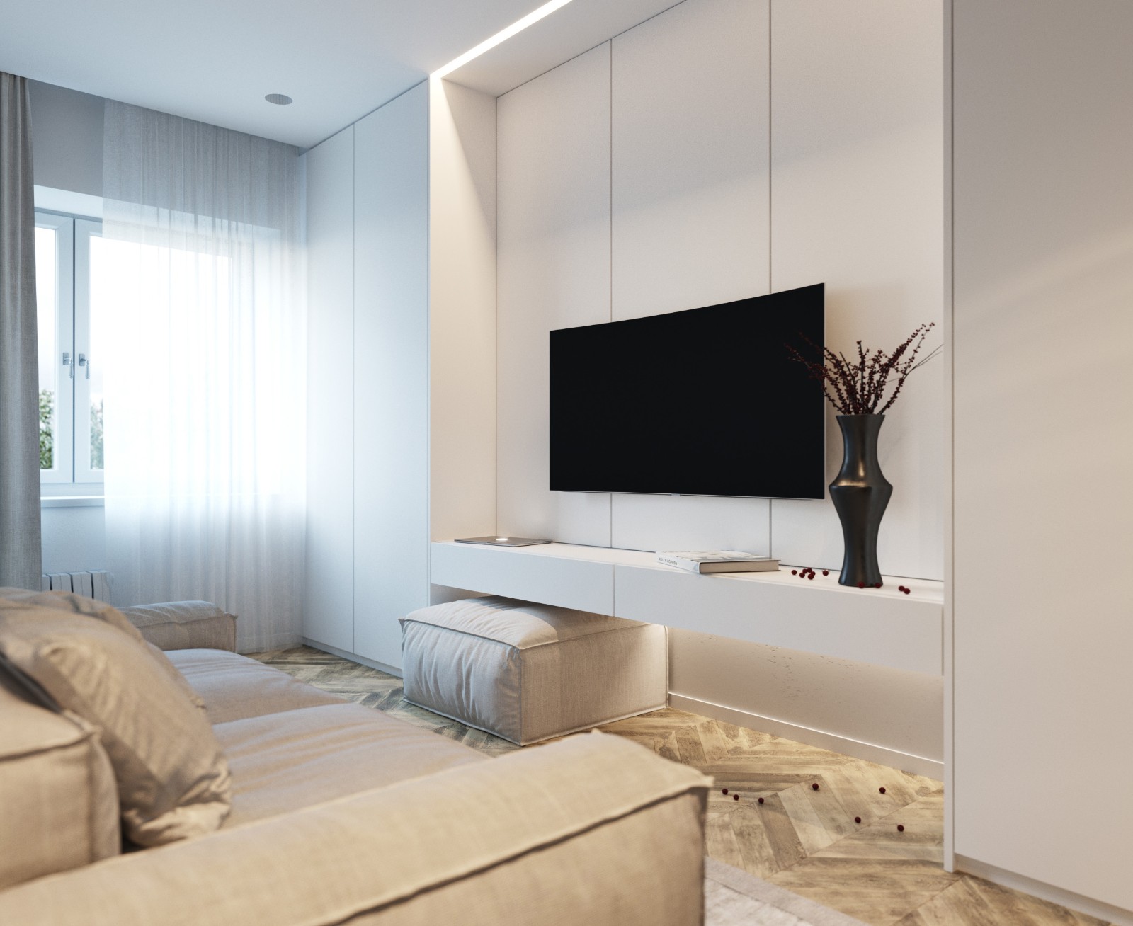 电视背景墙嵌入收纳柜,无把手的设计显得整面墙体更加和谐一体,美观又清爽。电视柜下方悬空,上实下虚,整个空间才通透有层次感。 白色的背景造型***的保留了空间的纯粹,不加修饰,在视觉上对空间进行了延伸。沙发一侧依墙体量身定制的开放格收纳柜,收纳装饰两不误,小户型的每一寸空间都不能放过。