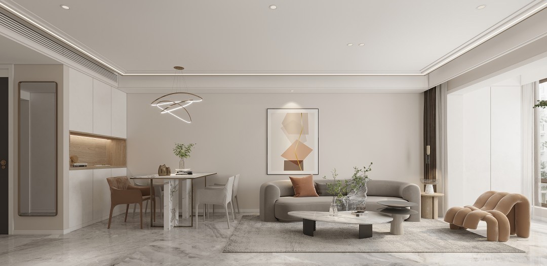 轻奢风格的空间以中性色调为主,用色彩的纯度传递细腻的质感。造型简洁,线条流畅的家具组合搭配,营造出稳定、协调、温馨的空间感受,满足现代年轻家庭的轻奢需求