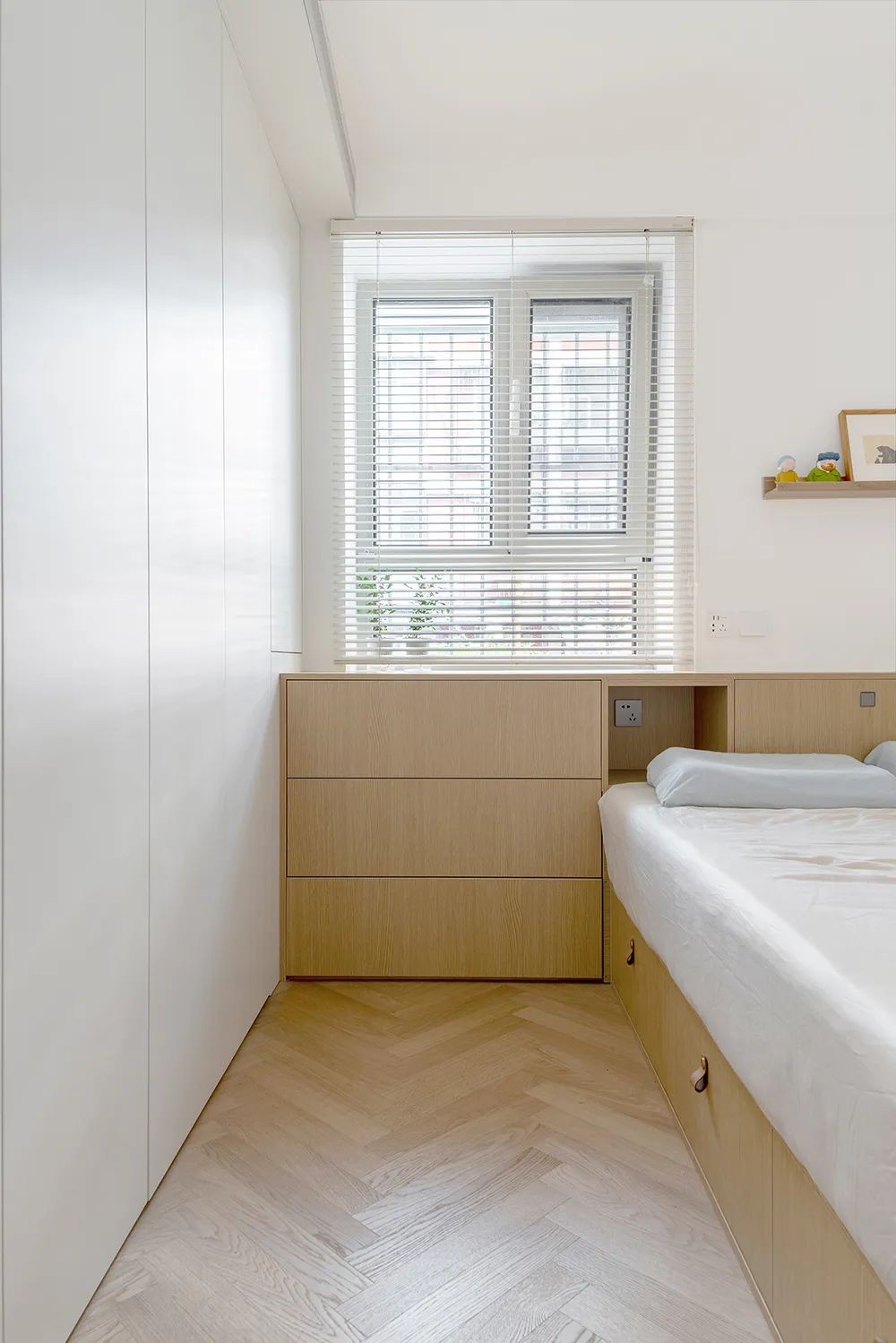 床头的位置两边都有床头柜,可以放一些平时的随手物品,上面也可以当做台面放置物品使用。卧室的床头做成一组柜子,具备收纳,也加宽了窗台,有一种飘窗的感觉。