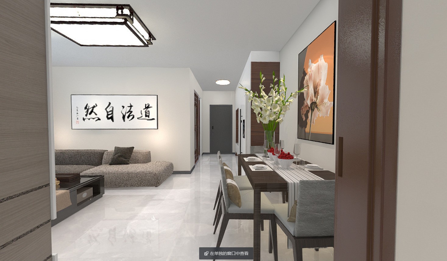 餐厅和客厅在一起,但是可以划分空间。中间过道合理分开,客餐厅的划分。
