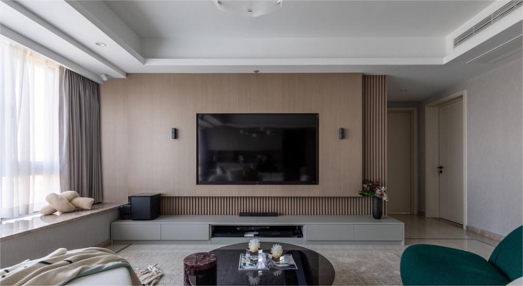 电视背景进行拆除,背景和吊顶都进行了预埋音响线。使用木饰面和木格栅上墙,电视做了嵌入式,还进行了一个音响的一个连接,在家里就能享受到音乐的世界。