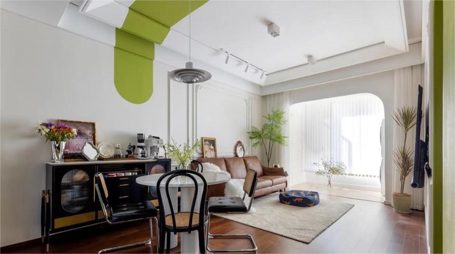 一面清新的绿色跳色,春天的气息娓娓而来。飞碟形状灯具搭配带有金属、藤编、皮质的餐桌椅,桌上摆一束鲜花,故事在这里悄然生长。