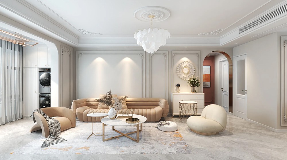 白色的单椅与墙面、地毯、茶几的色系相呼应,更加简约大气,奶茶色的弧形沙发点缀空间的配色,更为柔和与优雅。