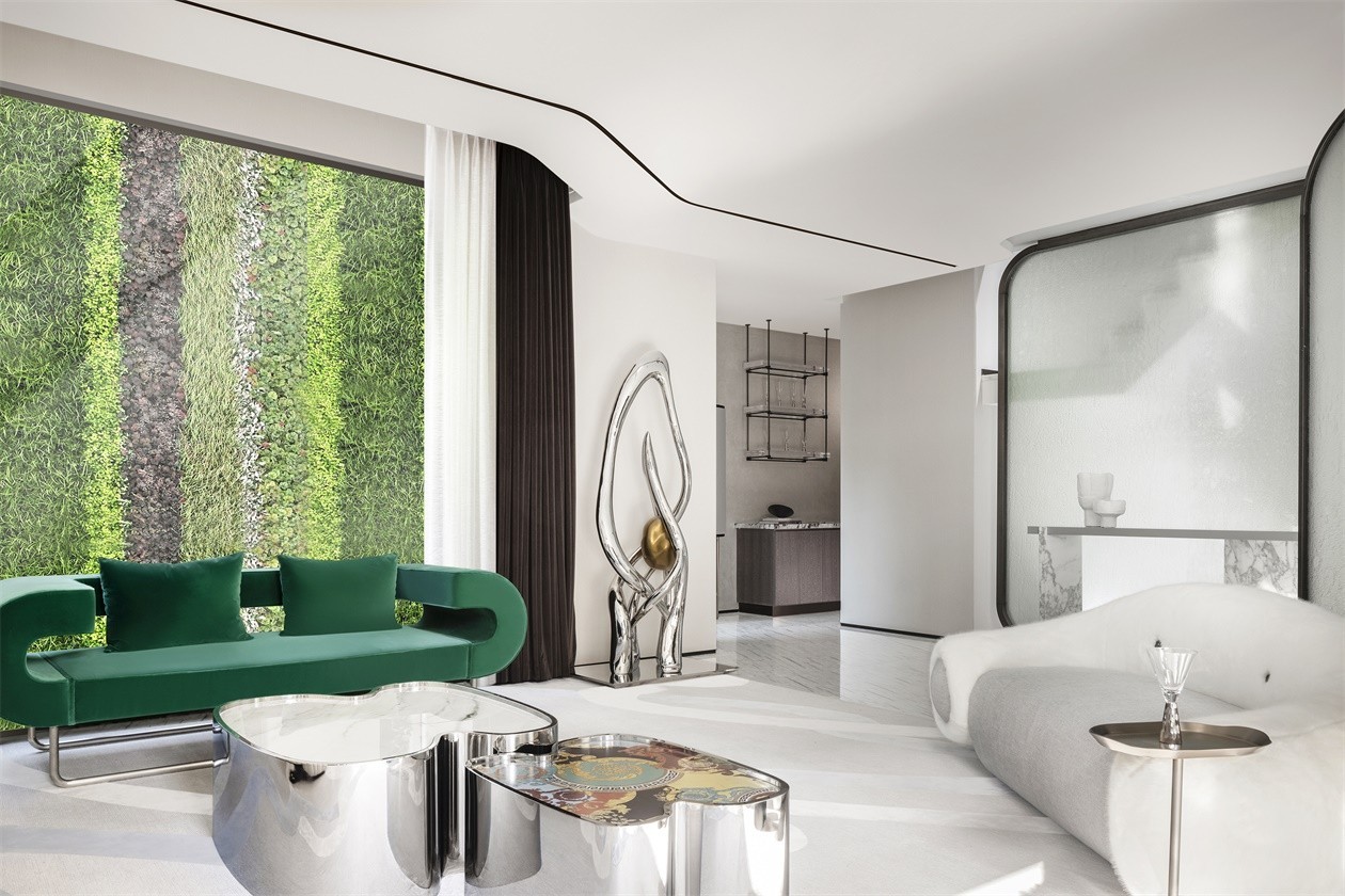 客厅被设定为艺廊,绿植墙和家具、艺术品形成视觉焦点;下图:客厅细节,艺术品与家具形成对话