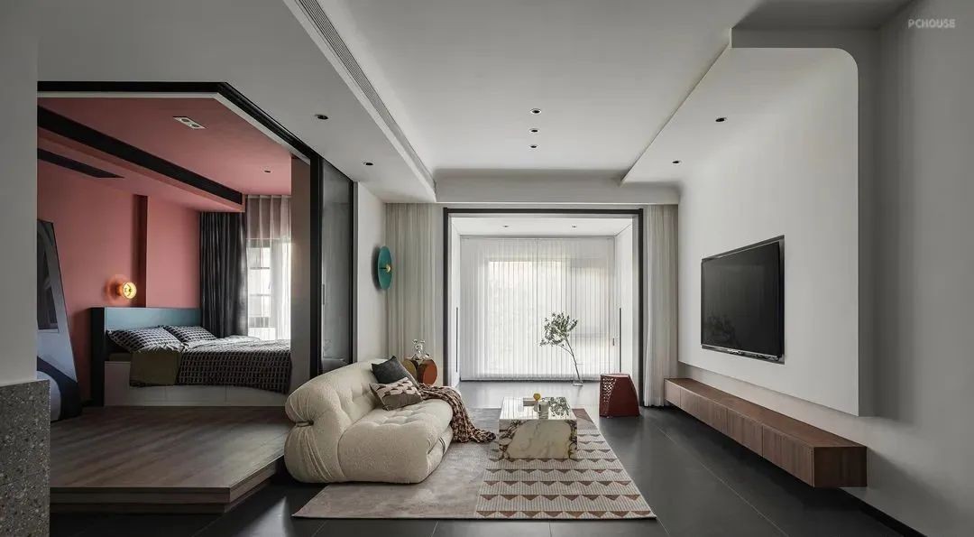 本期分享的案例位于五层外墙腰线层,窗外面对堡坎,本身的采光受到了影响。设计从光线入手,打开客厅旁房间,增加受光面,引入更多的光线。