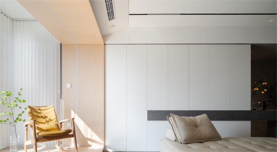 为满足委托人对空间的需求,回归大自然的告别喧嚣和寻求治愈的空间,我们在卧室的配色上选择了原木色与白色搭配,整个空间明亮简洁又舒服,没有多余的东西。 主卧艺术灯的设计很好地满足了阅读的需求。