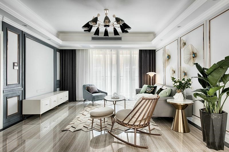 美式轻奢客厅 围绕美式轻奢风格,突出都市、时尚、小资的氛围打造,不同于传统美式,更强调轻奢的格调。运用简化的美式家具与金属元素的配饰,来体现整体的精致和奢华感