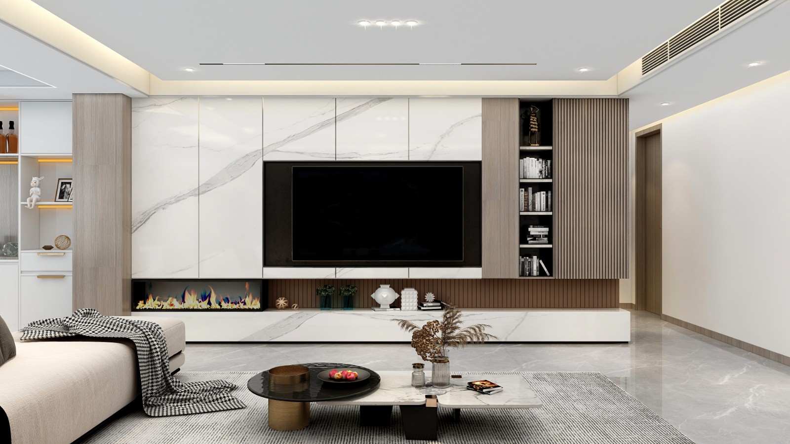 整个客厅以白色打底,不同材质的白色有更好的层次感,让统一之中又有变化,咖色做点缀,点醒整个空间,但又不浮躁