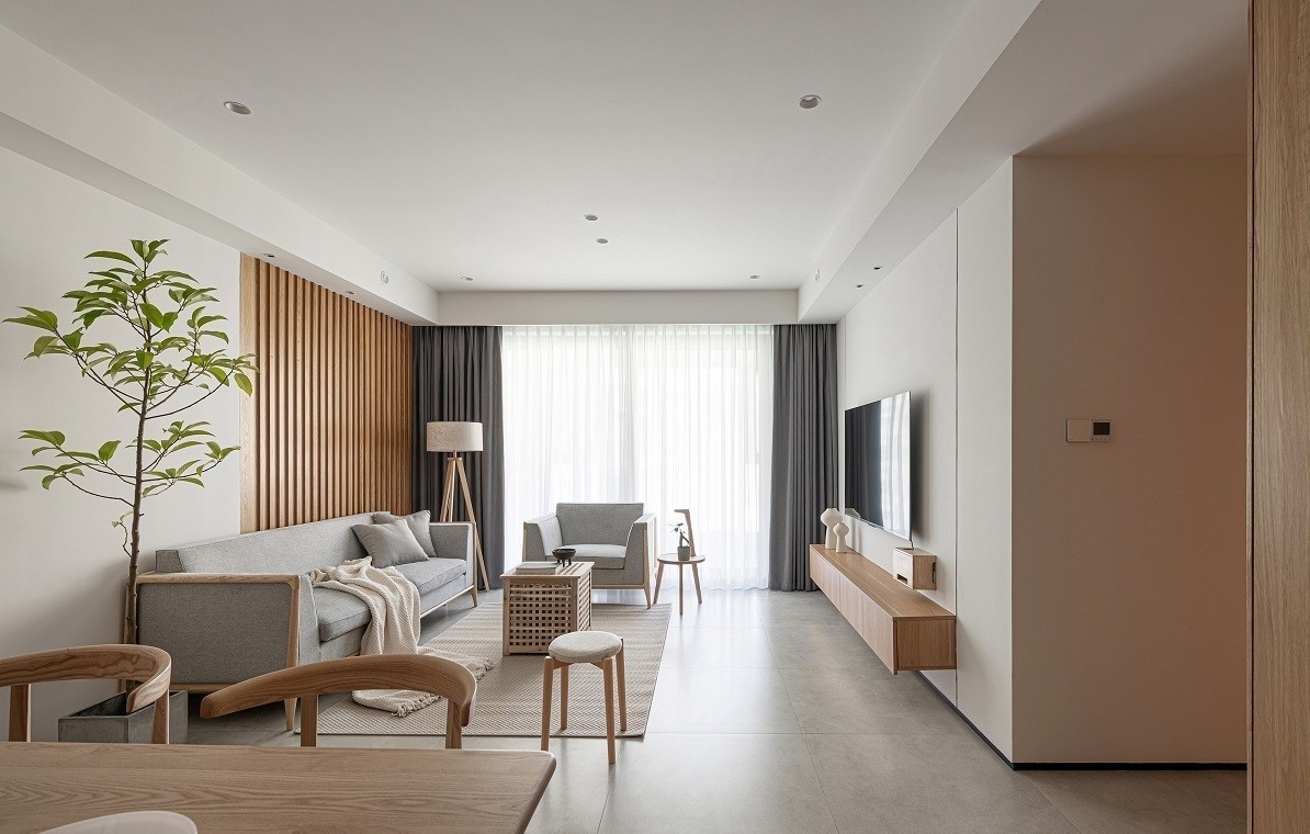 以白色为墙面基调,无主灯设计,让顶部大面积留白,视觉上拉升空间层高,让空间更为立体。大量原色木材延伸空间各处,消除现代设计的单调感,赋予空间素净的暖意。