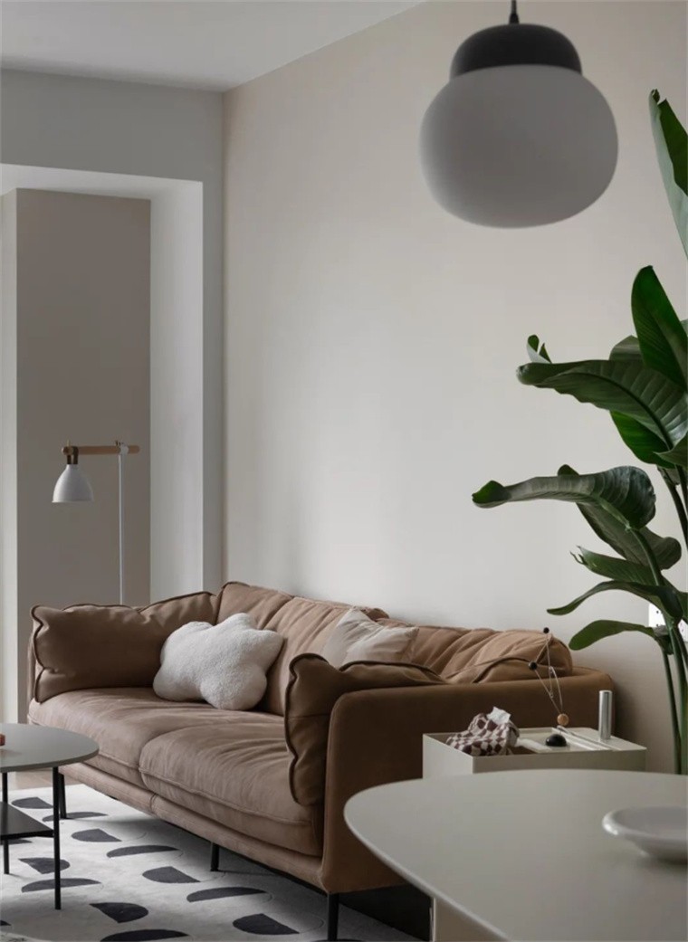客厅,温和的有色乳胶漆塑造空间恬静而温暖气质,左侧纯白的电视墙储物柜,满足该空间的收纳需求