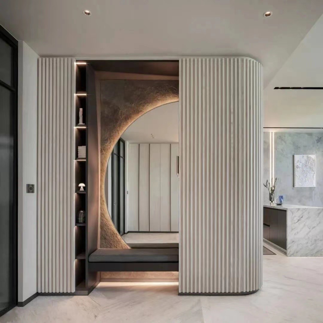 卧室颜色偏浅色,床头做条形格栅板,原飘窗拆除 做梳妆台。