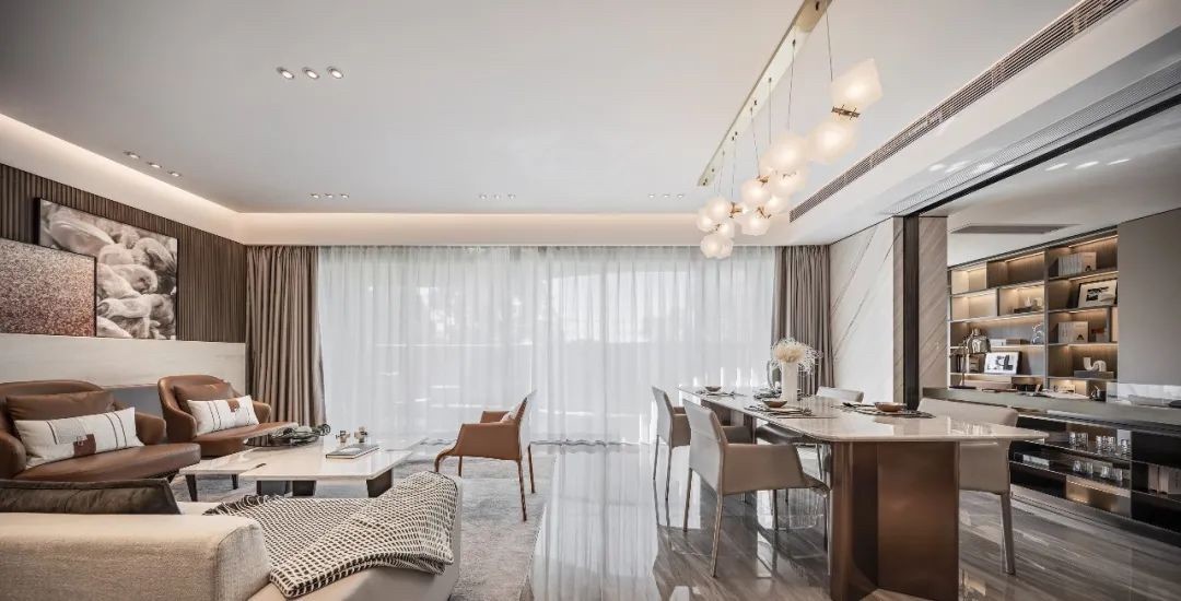 大平层户型复合的住宅功能及精英群体对品质生活的审美取向,打造、建立让居者回家瞬间,便可感受到与其身份气质相配的场域氛围和空间精神。
