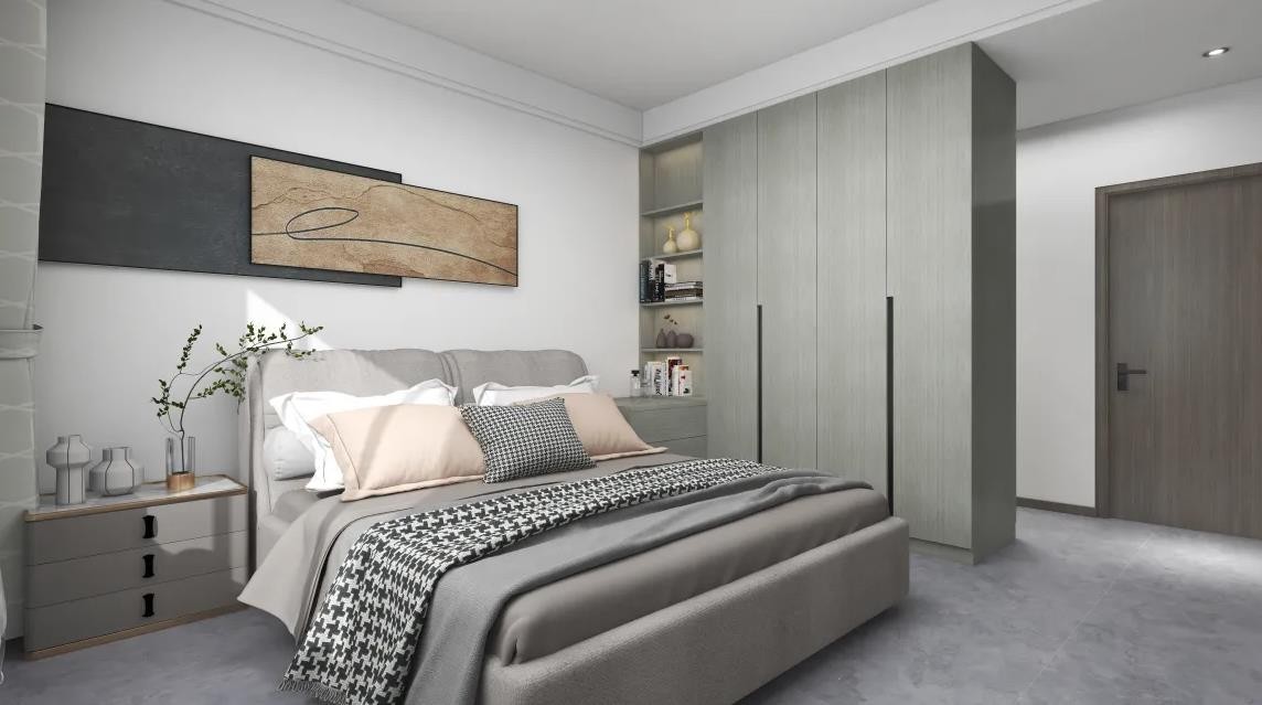 卧室设计灰色原木加白色,整体色调和谐,温馨