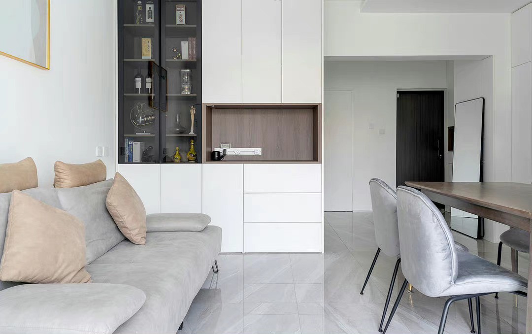 本设计定位为现代简约。入户做到顶鞋柜,收纳摆设两不误。