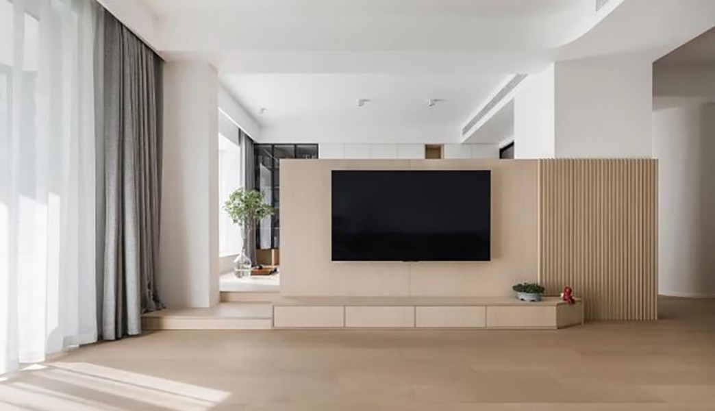客厅电视背景墙是整个居室的中心连接点,既是墙面也是隔断,客厅、书房、过道因此有了更紧密的关联。我们打掉原先隔墙后,将空间"打破重组",半墙高度设计给多维的空间预留了更多的交流机会。