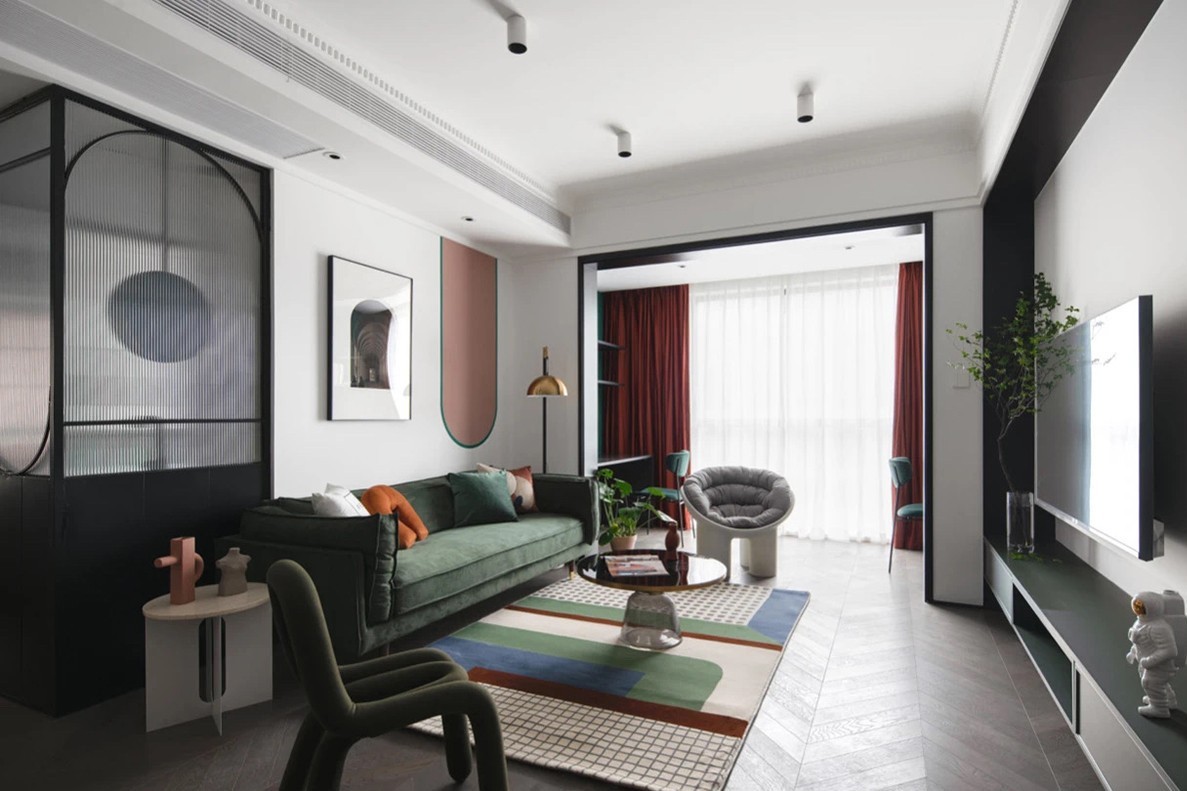 客厅空间以白色为主色调,融入墨绿、酒红、脏粉等低饱和度彩色,为空间增添了缤纷、动感的视觉效果。主沙发右侧轻盈有趣的bold chair与左侧“憨厚”的大象椅相互制衡,平衡了大象椅的敦厚感。