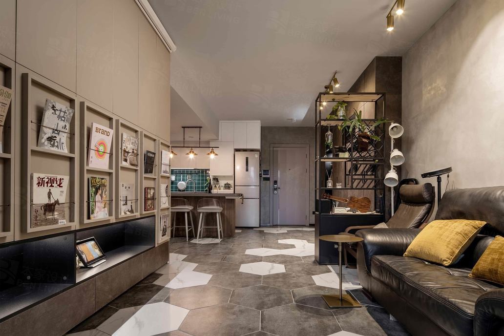 公共空间整体风格采用工业风,为黑白灰为主色调,辅以暖黄色木质元素,为空间增添温馨感,屋内的每一个单品都很温暖,体现出业主对生活的热爱。地砖采用灰色系大理石六角形地砖,灵动活泼,同时六边形的造型打破了空间进深过长的弊端,拉伸视觉。