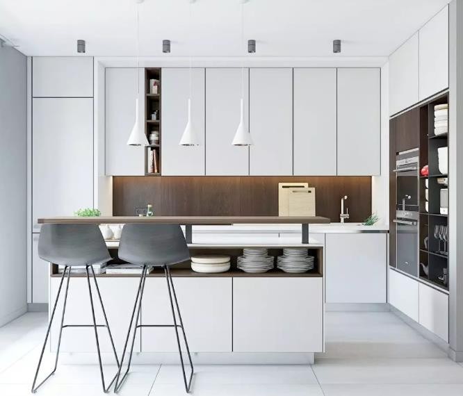 通过选择落地玻璃窗或开放式厨房,宽阔开敞的格局,让我们一目了然。大面积的光线直入内心,延展了我们的视野,将自然绿景漫伸入室。 而用岛台或吧台代替实墙,空间会显得更通透,尤其小户型可以参考,让小空间也能拥有豪华大平层既视感。