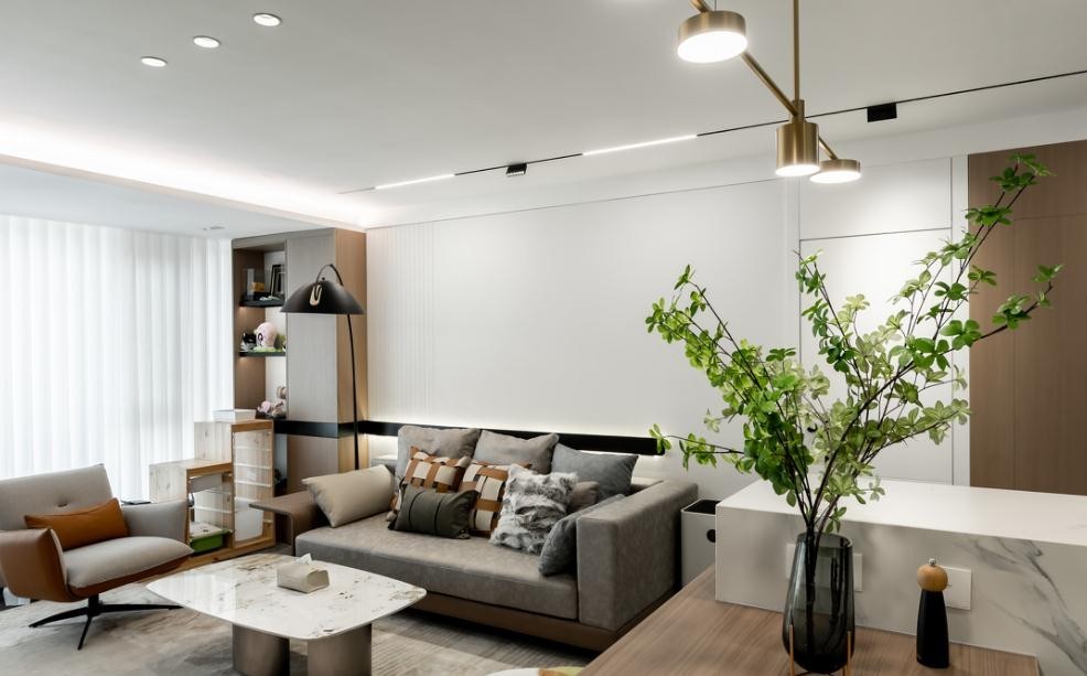 灯光系统是客厅区域的多功能性之外,最受屋主喜欢的。靠窗区域的吊顶上内嵌灯带,消除梁体的沉重感,天花板上的轨道筒灯和射灯用线性光线构造上层空间秩序,是提升精致感的点睛之笔。 整体空间利用多重材料:意大利灰地砖、金属壁龛、绿色系软装,旨在空间层次更加丰富。