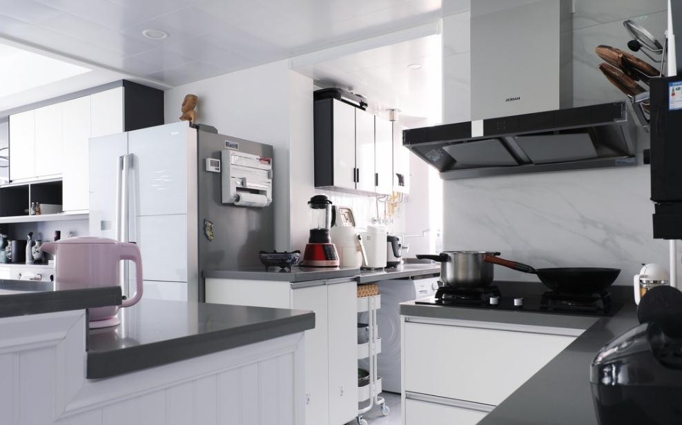 厨房主要以白色和黑色为主基调,不突出,却很日常。充足的收纳柜能够摆放众多厨具用品,台面选用了黑色岩板材质,耐脏还好打理,不容易渗色,清洁起来更方便。橱柜门选择了白色烤漆板,搭配极简无拉手设计,美观性十足。