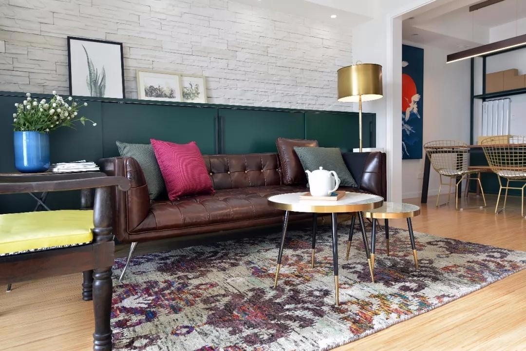 客厅选用大面积“森林绿”储物柜体,没有设计为通高。沙发选用咖色油蜡皮与绿色搭配,摩登,时髦。连沙发腿都伸出了满满的优雅。