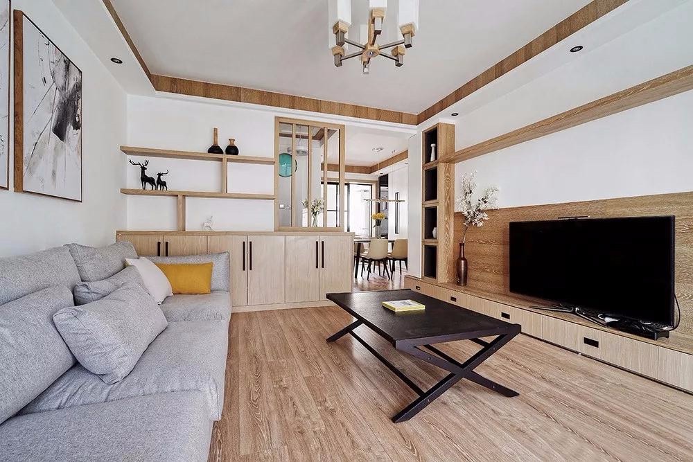 客厅使用大量的原木元素打造舒适柔和的居住感受,门厅与客厅之间用了一组储物柜结合木质隔断的做法来区分两个空间,隔而不断,不会一览无余。