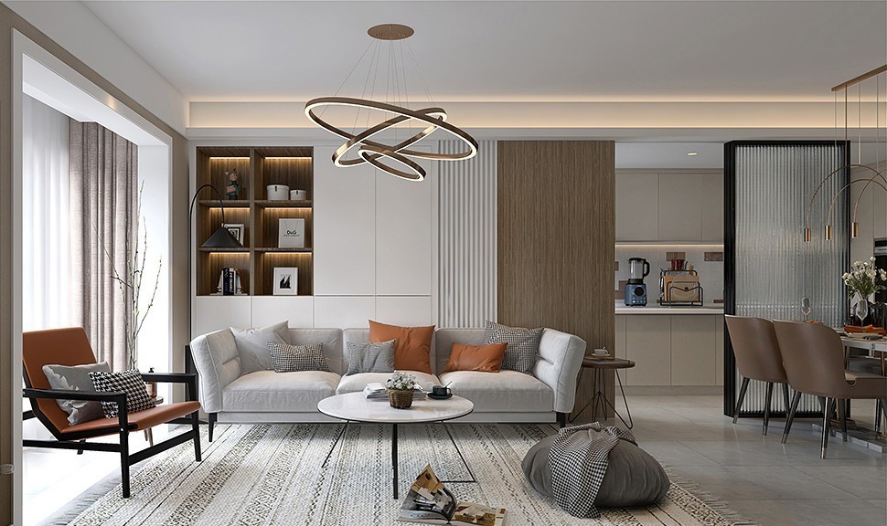 本案为平层住宅,整体风格为现代简约风,现代简约的设计风格具有实用、简洁、功能性强的特点,将设计的元素、色彩、照明、原材料简化到最少的程度,但对色彩、材料的质感要求很高。因此,现代简约的空间设计通常非常含蓄,往往能达到以少胜多、以简胜繁的效果。简洁的造型和别出心裁的摆放,打造温馨、时尚的家具空间。简约而不简单,高雅而不奢靡,细节打造舒适生活。