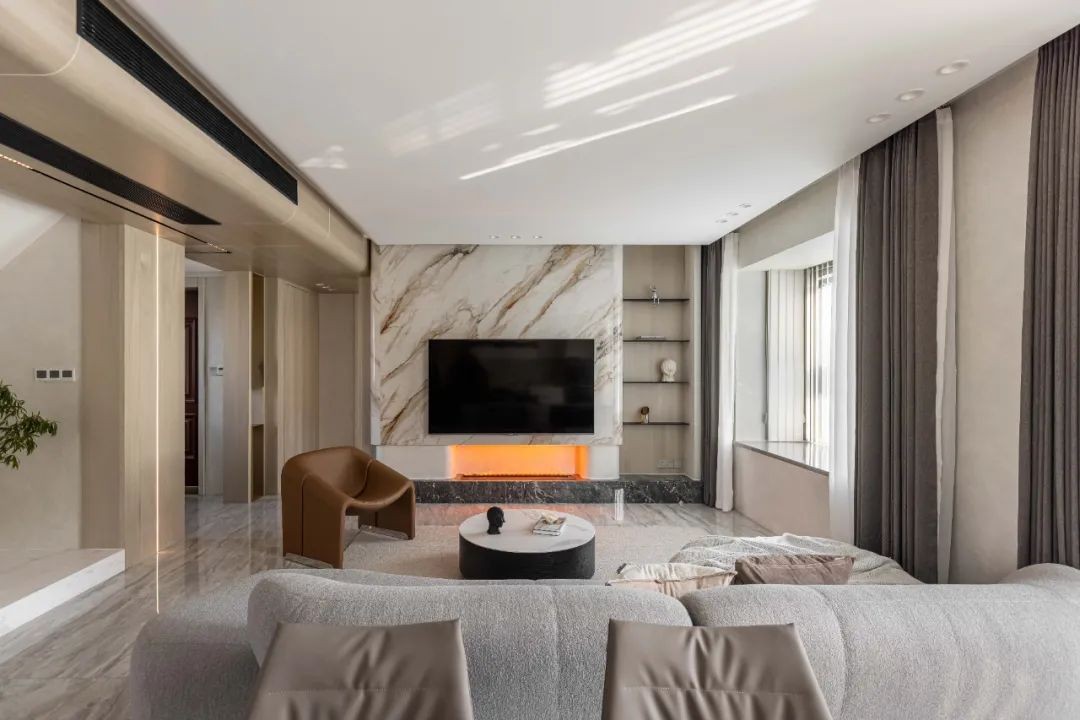 电视墙采用岩板热弯工艺,沉静温润的石材与下方壁炉跃动的火苗相映成辉,既动且静,自成一景。
