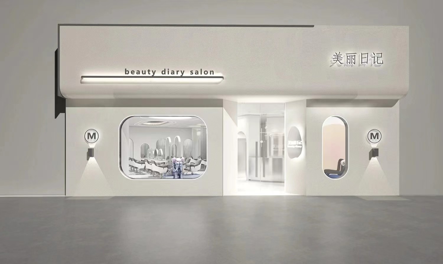 真石漆为底面材质,采用哑光不锈钢发光色为搭配,圆弧玻璃借景于室,框景如画的手法打造门面。