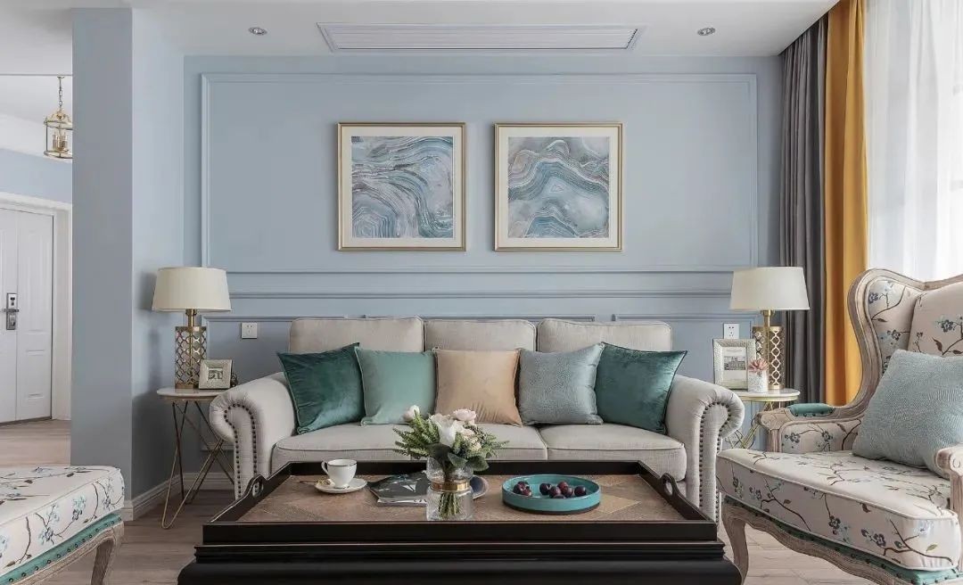 客厅,整体以低饱和的蓝绿色为主,以黄色、奶咖色、灰黑色得软装点缀,冷暖结合,营造出温馨优雅的居家环境。