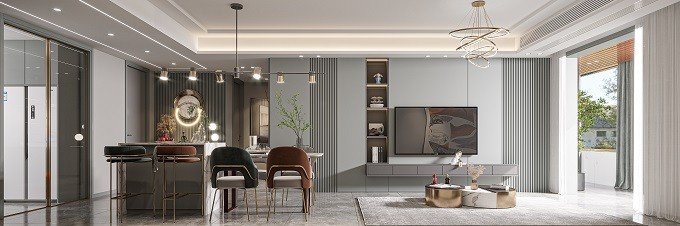 厨房的橱柜采用了和客厅墙板同样颜色的柜体,让定制这个概念清晰可见