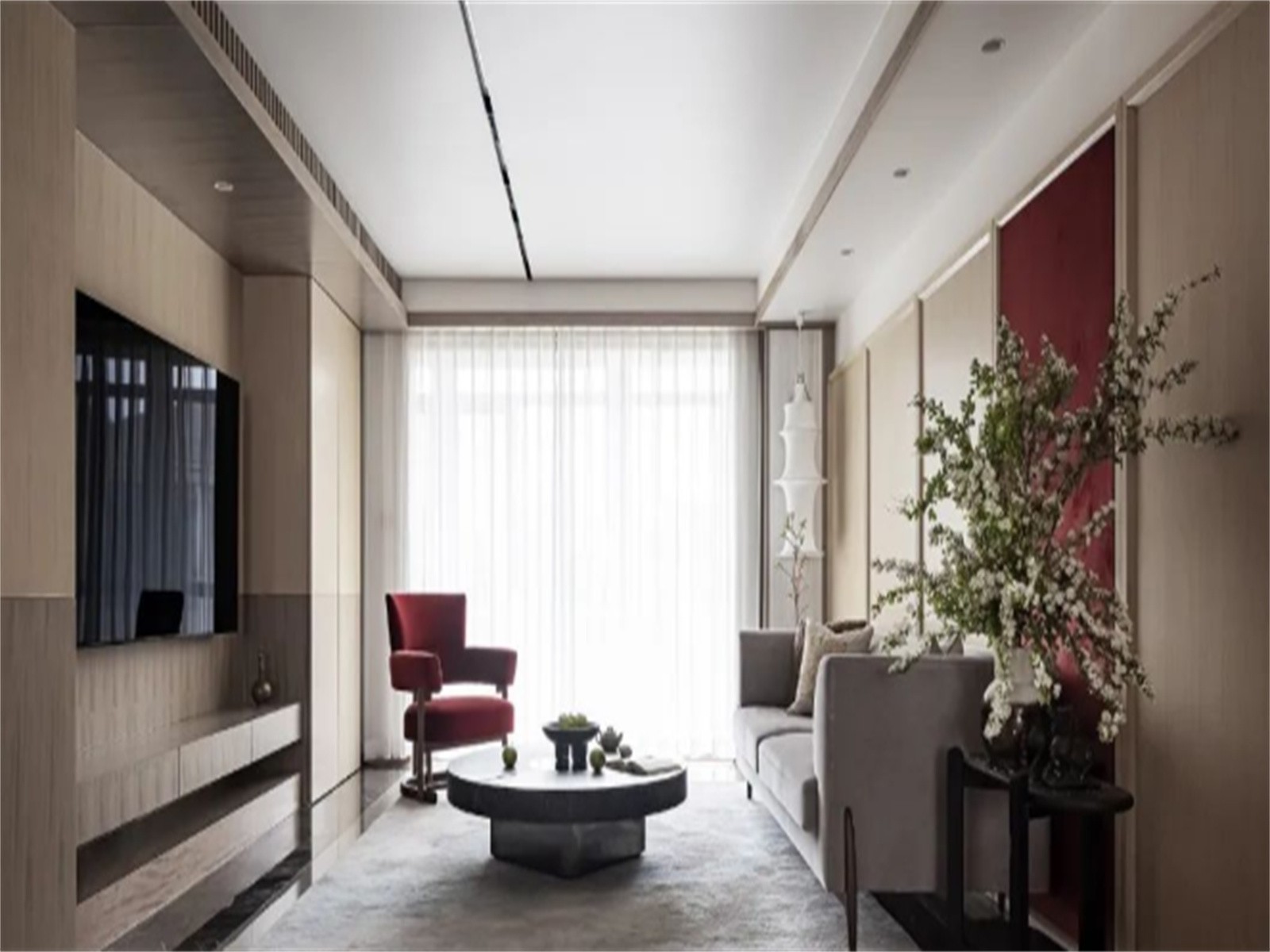 客厅,无主灯顶面设计,电视墙用木饰面做分色处理,靠近阳台一侧的是收纳柜,美观且实用