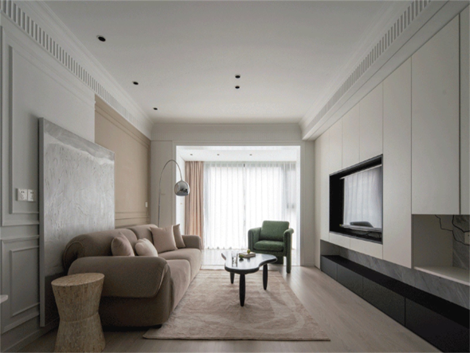 墙面用法式元素的石膏线和不同色块进行交融,一半沙色赋予空间适度暖色调阳台,利用地毯和沙发的翻绒材质来加强柔和温暖氛围