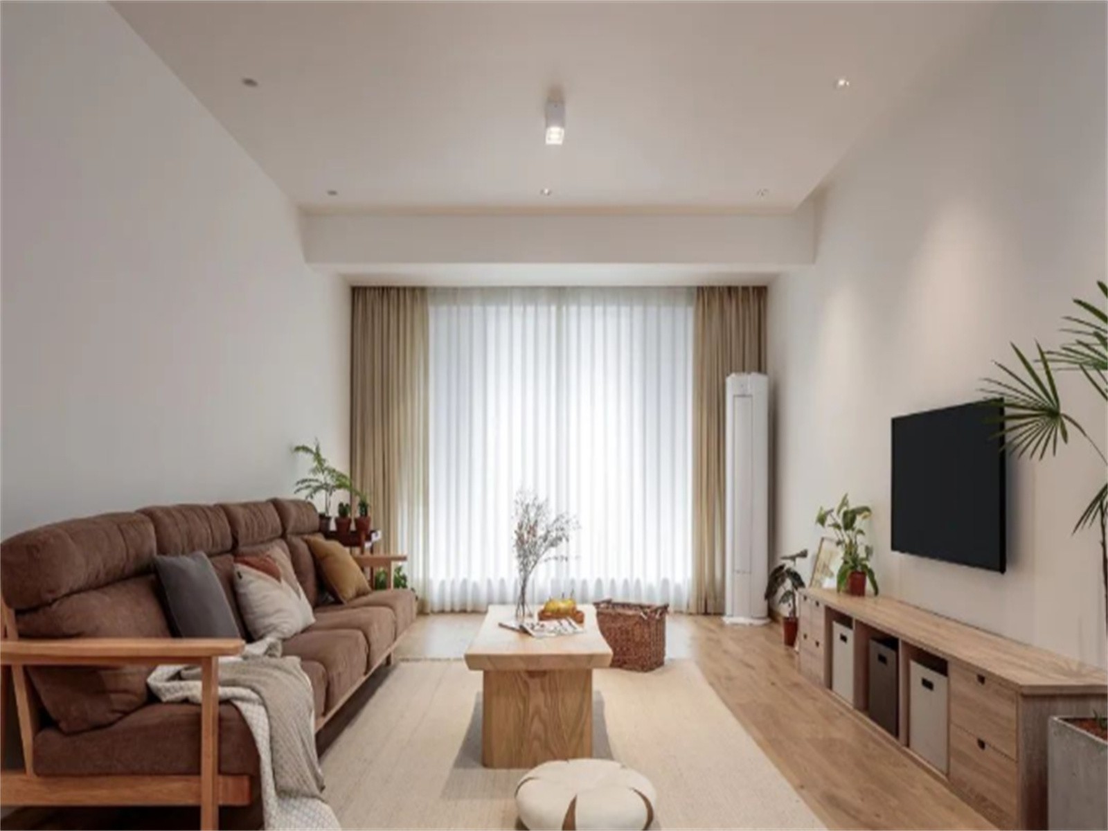 客厅,木地板搭配无主灯顶面,以日式原木为基调