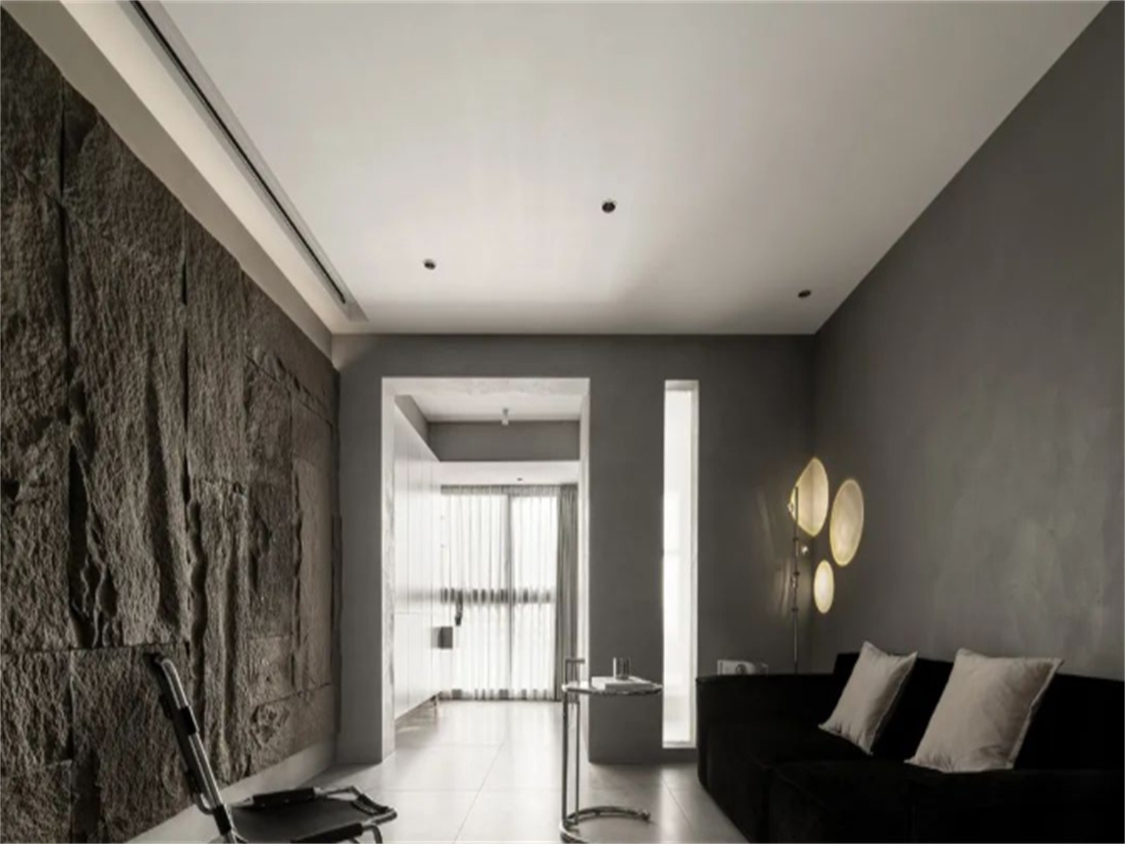 客厅纳入阳台,灰色地砖搭配无主灯极简顶面,浅灰***术涂料将空间的色系拉开层次,与石皮形成对比