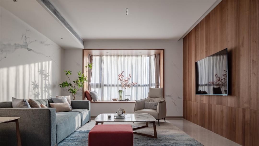 主卧整体设计走的低饱和度色彩,内敛稳重。“线”与“面”的元素贯穿整个空间,静谧与质感的格调氤氲而生。