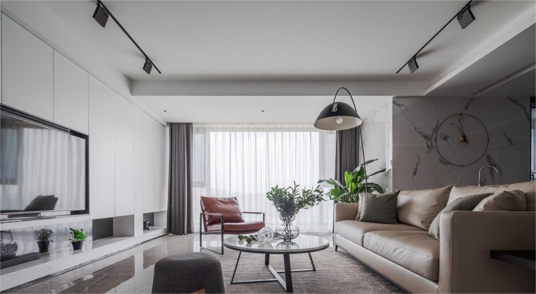 客厅以浅色木质和黑白灰为基调,空间强调色彩的沉静和造型线条的简洁。落地窗将充盈的自然光引入室内,使客厅宽敞明亮,简洁干净的块面和线条营造出空间的温暖与惬意。
