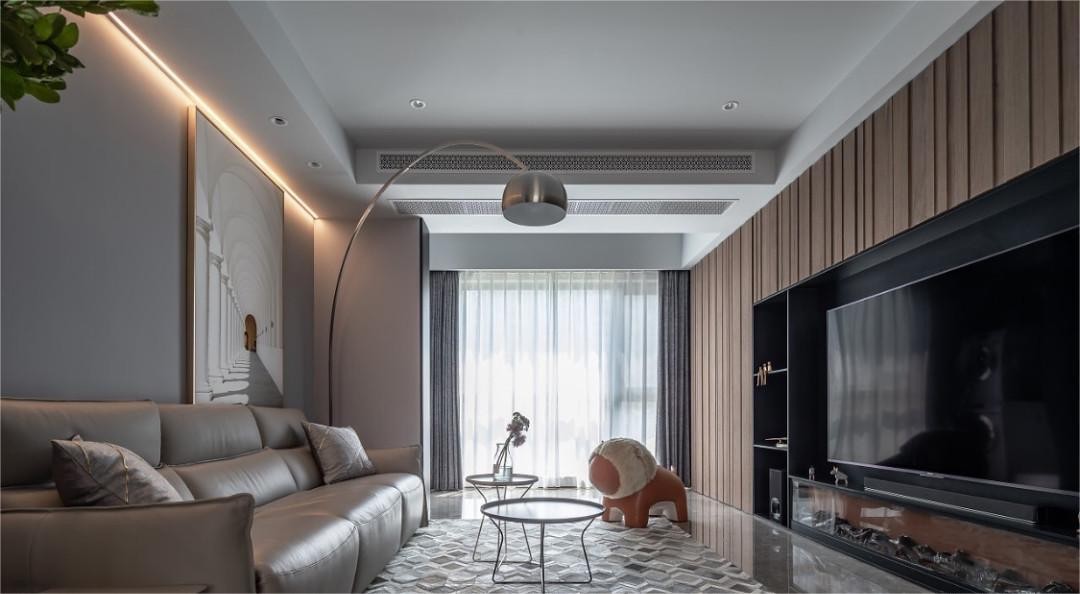 门板的不规则线条造型避免了整体柜子过长而显得呆板,黑色不锈钢弱化了壁挂电视机存在的疤痕效果。 填平的吊顶,简洁的射灯,柜内透出的光亮、墙面由强至若的光晕,再加上3.3m的壁炉燃烧的火焰,影影绰绰。