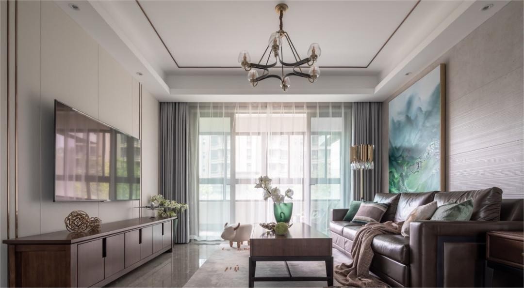 置身其中,简洁大气的哑光砖上墙,纯皮质的主沙发、布艺的单椅、实木的茶几、边几搭配羊毛地毯,材质上丰盛、色彩上有主次、相得益彰。客厅沙发背后清澈而柔和的森林绿作为点睛之笔,凸显了一种森林系的美感,深邃引人深思,仿若夏日里的一缕缕清风拂面,加之搭配了木质家具,浓烈的大自然气息沁人心脾