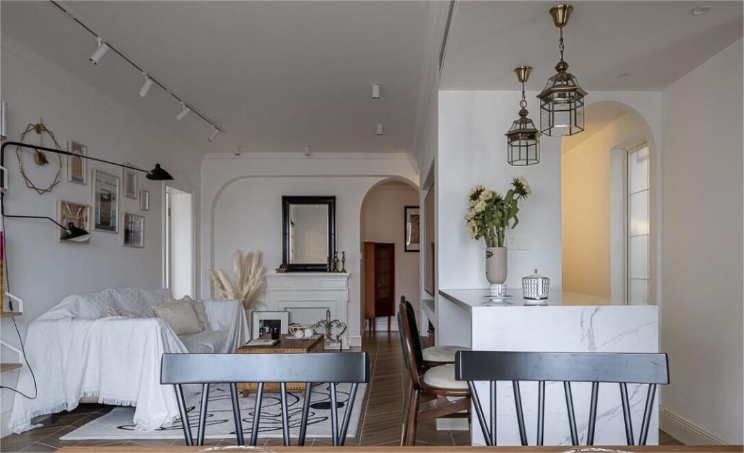 入户增设玄关,并采用对称的拱门形式,归家得以缓冲同时增强了入户的仪式感。玄关隔断采用了部分透光砖,若隐若现的空间内部,让空间更有趣味。