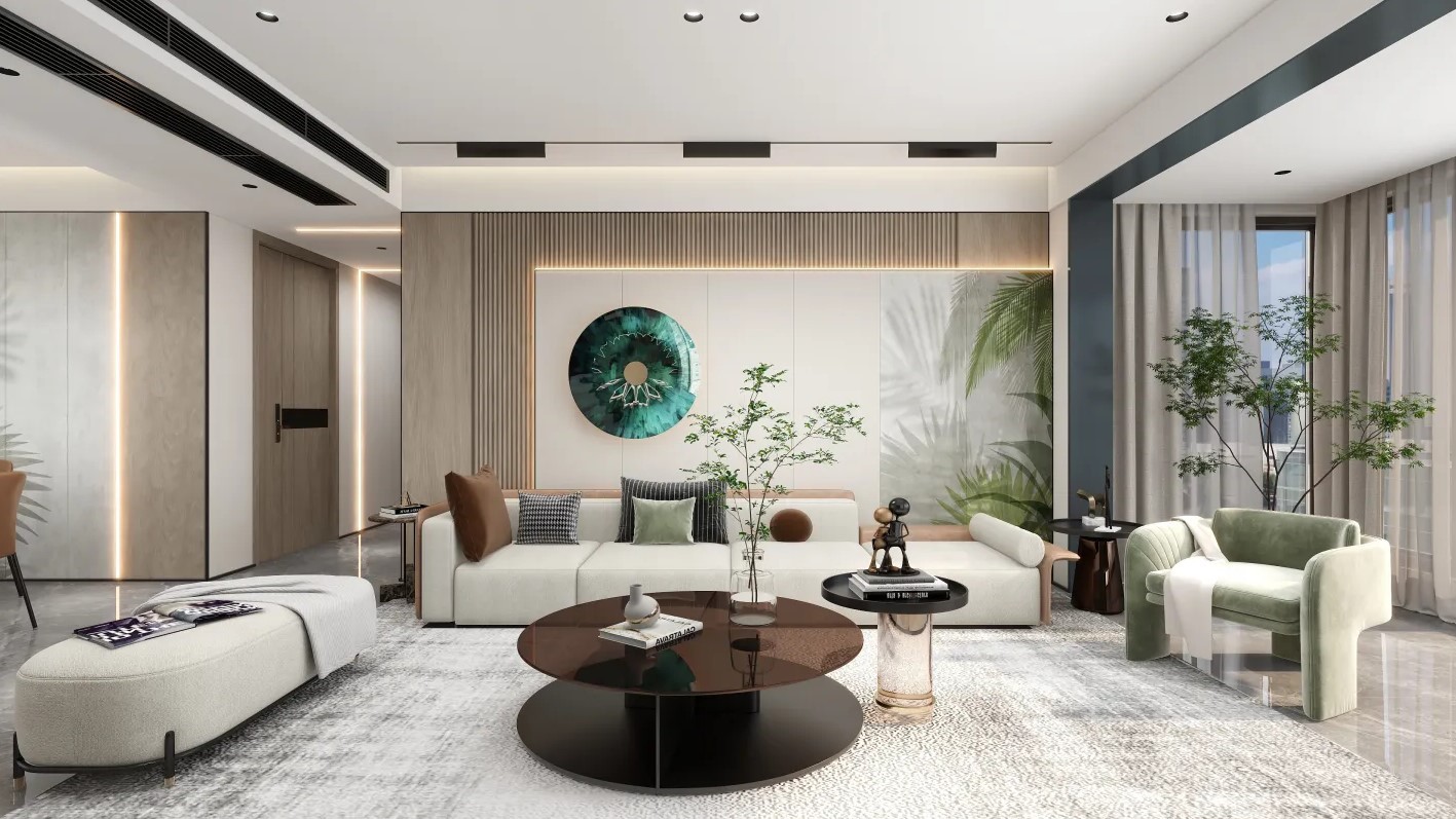 客厅拥有超大阳台,景色无限,茶几的颜色为深棕色也融入了整个环境之中。