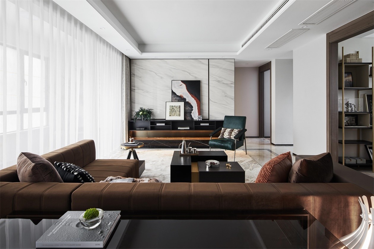 由简至奢,随心而居。CCA香榭蒂设计将抽象艺术的曲线之美运用于客餐厅的设计中,棕色调的皮质座椅与墙面艺术装置相呼应,让空气中弥漫了几分古典的艺术感。