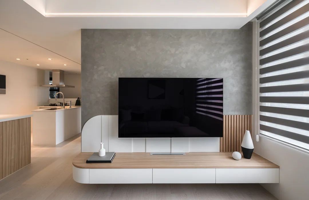 顺随入门动线,目光所及***眼,正是电视主墙落下之处,将无印风格元素带入主墙,以相当微量木格栅缀饰,再由白色木作,缓缓跳接格栅肌理。 不规则间隙错落,浮现彷若如光洒落般的惬意,左上侧以圆弧角收边,无论视线从远或近望入,都能感受一曲微弯的张驰有度。