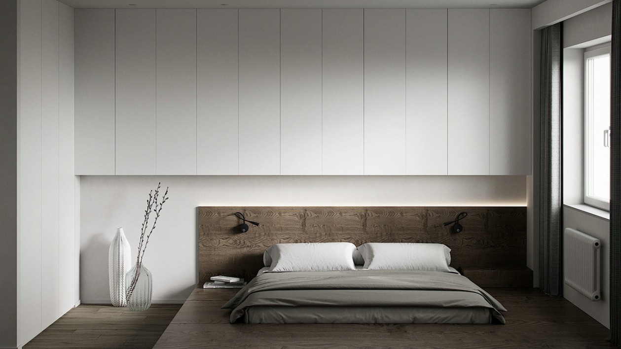 次卧床头背景直接做成柜体,增加储物空间且有很好的装饰性,原木色床架更贴近自然。