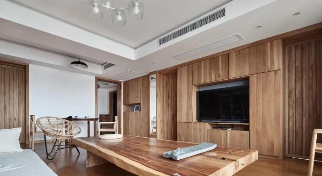 电视背景墙同样是实木打造,统一了空间的视觉感,同时也拥有更强大的收纳空间。