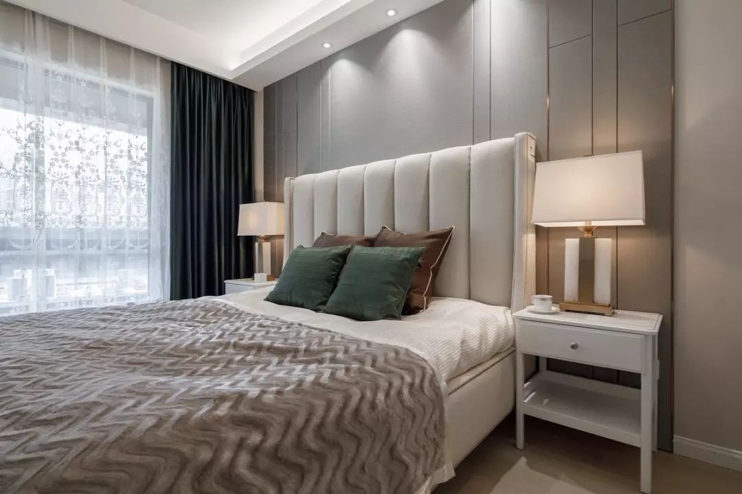 主卧以浅灰色为主色调,浅灰色硬包床头背景墙结合同色系软床、浅灰色家具,给人带来一种温馨端庄的安心感。