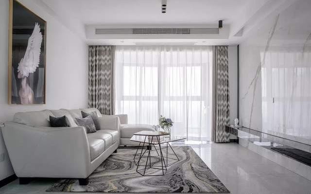 南北通透的户型,使得客厅区域采光良好,结合业主喜欢黑白灰的装修格调,整个空间的视觉效果,非常大气且有质感。