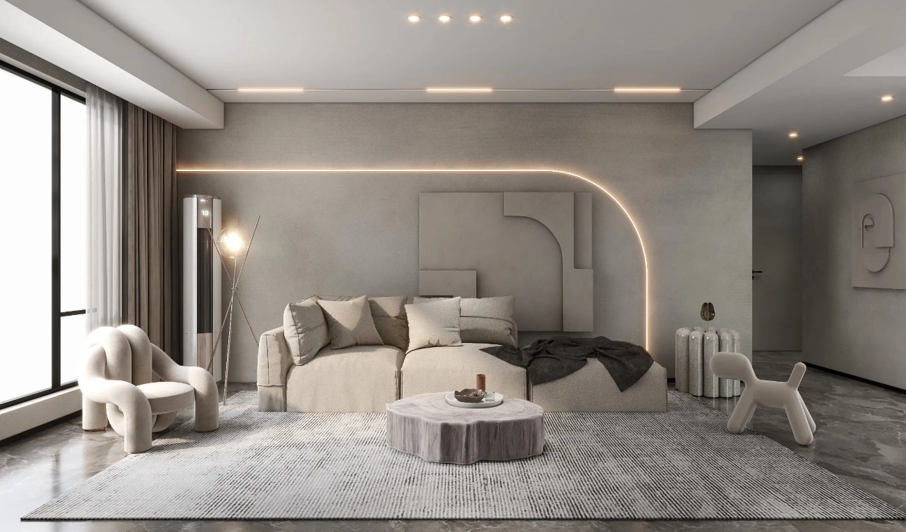 沙发背景墙作为空间的整体一个亮点,做了石膏板内嵌线形灯带,弧形的造型增加了一些艺术气息,让整体氛围感更加浓郁。